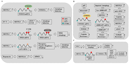 Roles of RNA methyl transferases in autophagy and anticancer drug resistance. (A) METTL3 promotes autophagy by increasing the expression of FOXO3A. METTL3 promotes autophagy by increasing the expression of ATG5/-7 and LC3-II. METTL3 inhibits autophagy by decreasing the expression of TFEB. METTL14 mediates the effect of rapamycin, an inducer of autophagy, by decreasing the expression of eIF4G1. Downregulation of METTL1 induces autophagy by decreasing m7G tRNA and oncogenes and negative regulators of autophagy. (B) METTL3 promotes or inhibits autophagy in a context dependent manner. (C) FTO enhances cisplatin sensitivity by promoting ULK1-mediated autophagy. METTL3 enhances anticancer drug resistance by promoting autophagy. KIAA1429 recruits YTHDF1 to increase the expression of FOXM1, which results in cisplatin resistance. ↓ denotes decreased expression/activity. ↑ denotes positive regulation. Hollow arrows denote direction of reaction. Hollow arrows denote direction of reaction.