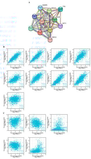 Correlation between NUF2 and Tumor Stemness Markers. (A) The top 10 genes correlated with NUF2 in the protein–protein interaction network. (B) Correlation between the mRNA expression level of NUF2 and related genes. (C) Correlation between the NUF2 mRNA expression level and tumor stem cell markers.