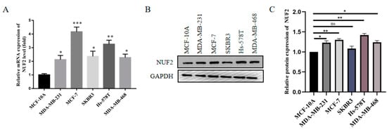 Through the qRT-PCR detection of breast cancer cell lines, we found that the expression of NUF2 was upregulated in breast cancer cell lines compared to normal breast epithelial cells, MCF-10A (Figure 7A). The same results were obtained by Western blot, and the expression level of the NUF2 protein was significantly upregulated in the breast cancer cell lines (Figure 7B,C).