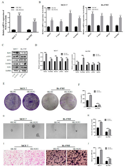 After verifying that NUF2 knockdown inhibited the tumorigenicity of MCF-7 and Hs-578T, we sought to test whether the overexpression of NUF2 could similarly promote the capacity for tumorigenicity. Subsequently, NUF2 plasmids were constructed, and cell lines with a stable overexpression of NUF2 (OE-NUF2) were constructed. QRT-PCR and Western blotting analysis were used to assess the NUF2 overexpression efficiency (Figure 9A,B). Upon the Western blot examination of NUF2 overexpression, the expression of the given tumor stemness marker was also stimulated (Figure 9C,D). The clonogenesis experiments demonstrated that NUF2 overexpression promotes the cell proliferation capacity (Figure 9E,F). The spheroid experiment also showed that NUF2 overexpression promotes the proliferative capacity of tumor stem cells (Figure 9G,H). The transwell assay results demonstrated that OE-NUF2 could promote the invasive ability of breast cancer cells (Figure 9I,J).