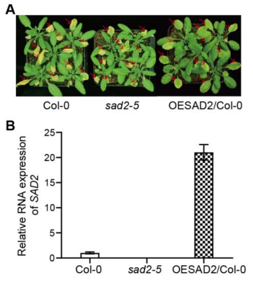 Arabidopsis ecotype Col-0, the SAD2 knockout mutant sad2-5, and the SAD2-overexpression line OESAD2/Col-0 were used in this study. sad2-5 is a previously described T-DNA insertion line [29,30]. OESAD2/Col-0 was generated for the present study by inserting the coding region of SAD2 into the pCAMBIA1307 vector under the control of the cauliflower mosaic virus 35S promoter. Col-0 was transformed with the recombinant plasmid by Agrobacterium-mediated transformation via floral dip, and T4 homozygous lines were used for this study.