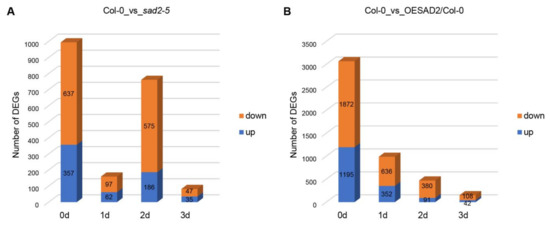 Differentially expressed genes (DEGs) in SAD2 knockout and overexpression lines (sad2-5 and OESAD2/Col-0, respectively) compared to Col-0. (A) DEGs between sad2-5 and Col-0 at multiple time points after inoculation with Pseudomonas syringae pv. tomato (Pst) DC3000. (B) DEGs between OESAD2/Col-0 and Col-0 at multiple time points after inoculation with Pst DC3000. “d” here indicates days post-inoculation with Pst DC3000.