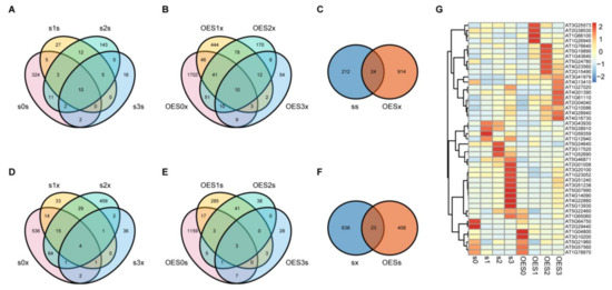 Venn and heatmap analyses of differentially expressed genes (DEGs). (A) Venn analysis of DEGs that were up-regulated in sad2-5 compared with Col-0 at 0 days post-inoculation (dpi) (s0s), 1 dpi (s1s), 2 dpi (s2s), and 3 dpi (s3s) with Pseudomonas syringae pv. tomato (Pst) DC3000. (B) Venn analysis of DEGs that were down-regulated in the SAD2-overexpression line (OESAD2/Col-0) compared with Col-0 at 0 dpi (OES0x), 1 dpi (OES1x), 2 dpi (OES2x), and 3 dpi (OES3x). (C) Venn analysis of overlapping DEGs, i.e., those that were up-regulated in sad2-5 (ss) and down-regulated in OESAD2/Col-0 (OESx). (D) Venn analysis of DEGs that were down-regulated in sad2-5 compared to Col-0 at 0 dpi (s0x), 1 dpi (s1x), 2 dpi (s2x), and 3 dpi (s3x). (E) Venn analysis of DEGs that were up-regulated in OESAD2/Col-0 compared to Col-0 at 0 dpi (OES0s), 1 dpi (OES1s), 2 dpi (OES2s), and 3 dpi (OES3s). (F) Venn analysis of overlapping DEGs, i.e., those that were down-regulated in sad2-5 (sx) and up-regulated in OESAD2/Col-0 (OESs). (G) Heatmap analysis of expression profiles of the 45 overlapping DEGs. “s” here indicates sad2-5; “OES” indicates OESAD2/Col-0; and numbers following “s” or “OES” indicate dpi with Pst DC3000.