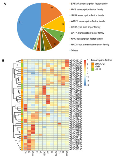 Expression levels of differentially expressed transcription factor (TF) family members in response to pathogen infection. (A) TF family classification statistics. (B) Heatmap showing expression levels of differentially expressed TFs in the ERF/AP2, MYB, and bHLH TF families in Col-0 (C), SAD2-knockout (s), and SAD2-overexpression (OES) plants. Numbers following “C”, “s”, or “OES” indicate days post-inoculation with Pseudomonas syringae pv. tomato DC3000.