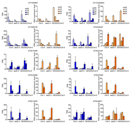 There were two genes in common between the 24 DEGs that were up-regulated in sad2-5 but down-regulated in OESAD2/Col-0 and the 23 DEGs that were down-regulated in sad2-5 but up-regulated in OESAD2/Col-0. Thus, we obtained a final set of 45 key common DEGs. Clustering the 45 DEGs based on relative expression levels in each genotype over the 3 dpi revealed three obvious expression patterns (Figure 3G; Supplementary Table S2). Nineteen DEGs displayed the first expression pattern, in which genes were significantly up-regulated in OESAD2/Col-0 after inoculation with Pst DC3000. For example, four DEGs (AT3G25573, AT2G38530, AT1G66100, and AT1G26945) were highly expressed in OESAD2/Col-0 but expressed at relatively low levels in sad2-5 at 1 dpi. Six DEGS (AT1G76640, AT5G19890, AT1G43640, AT5G24780, AT4G23560, and AT2G15490) were highly expressed in OESAD2/Col-0 at 2 dpi, and nine DEGs (AT3G41979, AT4G13410, AT1G27020, AT4G01390, AT1G61110, AT2G04040, AT1G10586, AT4G28940, and AT4G16730) were highly expressed in OESAD2/Col-0 at 3 dpi. Another 19 DEGs displayed the second expression pattern, in which genes were up-regulated in sad2-5 but down-regulated in OESAD2/Col-0 after Pst DC3000 inoculation. For example, AT5G13930, AT4G22880, and AT5G07990 were highly expressed in sad2-5 at 3 dpi but were expressed at relatively low levels in OESAD2/Col-0. Seven genes displayed the third expression pattern, in which there was weak induction by pathogen infection. In summary, after removing duplicate DEGs, we obtained a final set of 1825 DEGs that were induced by Pst DC3000 (Supplementary Figure S1), and 45 of those were key genes regulated by SAD2.