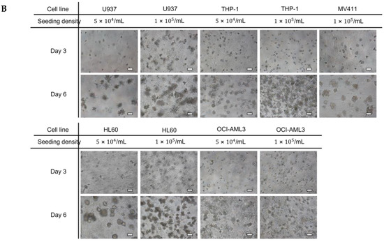 For optimization of culture methods within the SAPHs, several subtypes of human leukemic cell lines were studied within the unmodified 3D model; these included U937, THP-1, MV4-11, HL60, and OCI-AML3. The prototypical U937 suspension cell line (average diameter 14 µm) was used to optimize the concentration of peptide in the hydrogel that best supported AML cell survival and growth. A concentration of 6 mg/mL was identified as optimal for U937 cells (Figure 1A) and used as the basis for other cell types. All human leukemic cells survived and proliferated within the SAPH with some variation in growth dynamics between cell lines (Figure 1B). The proliferation of the cells varied in colony size and density, ranging from smaller, more compact colonies, as seen with THP-1 and HL60 cells, to larger, broader colonies as seen in the U937 and OCI-AML-3 cell cultures. The optical transparency of the SAPHs allows for quantitative readouts of cell proliferation. Seeding density does not appear to affect colony size in any cell line investigated, with both cell concentrations studied producing similar-sized colonies. This supported the hypothesis that the colonies are formed by cell proliferation rather than by cell migration from the local microenvironment.