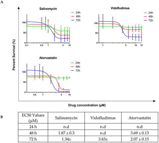 Candidate drug dose response assays for THP-1 cells in liquid culture. (A) Line graphs showing viability of THP-1 cells (as percentage survival) over time following candidate drug treatment at the indicated dosage as compared to 0.2% DMSO vehicle control. Mean values ± standard deviation of biological replicates (N = 4, n = 3) are plotted throughout. (B) Calculated EC50 values for each candidate drug at 24, 48, and 72 h following treatment.