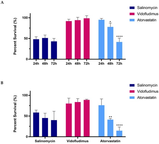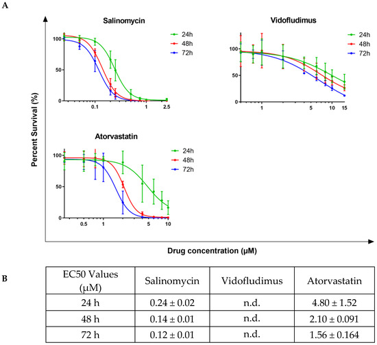 To initially evaluate the potential efficacy of the candidate drugs, a broad range of dosages of Salinomycin, Vidofludimus, and Atorvastatin were completed within liquid culture for the THP-1 human leukemic cell line (Figure 3A) and the mAF9 primary mouse leukemic cells (Figure 4A). Cells were assessed for viability at 24, 48, and 72 h following treatment with each drug of interest and recorded as percentage survival compared to vehicle control. The EC50 values, calculated where possible (Figure 3B and Figure 4B), were in the micromolar or sub-micromolar range for all drugs in both models by 72 h. Short-term drug treatment (24 h) of mAF9 cells showed measurable efficacy that was not seen in the growth factor-independent THP-1 cells, indicating greater sensitivity for the primary cells. Atorvastatin and Salinomycin both showed time- and dose-dependent reductions in cell viability across both models. Low dose Salinomycin (<250 nM) was sufficient to cause a 50% reduction in cell viability in mAF9 cells for all timepoints evaluated.