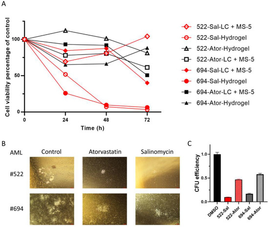 Atorvastatin and Salinomycin reduce the viability of AML patient samples in self-assembling peptide hydrogel (SAPH) culture and colony formation. (A) Line graphs displaying percentage survival of two AML patient samples (#522 and #694) treated with 5µM Atorvastatin (Ator) or 500 nM Salinomycin (Sal) for up to 72 h in standard co-culture (LC + MS-5) or 3D SAPH (n = 3 for LC + MS-5; n = 4 for Hydrogel). (B) Representative phase-contrast images, and (C) efficiency as percentage of control (n = 3) of colony formation in AML patient samples (#522 and #694) 14 days following treatment with 0.02% DMSO vehicle (Control), 5 µM Atorvastatin, or 500 nM Salinomycin.