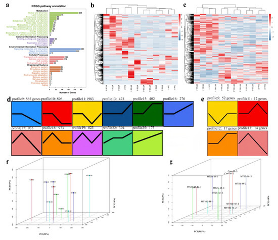 STEM analysis of RNAs (a,b,d,f) and miRNAs (c,e,g). (a) Enriched KEGG pathway annotation of RNA. Statistical summary of distribution of genes in each pathway for each trend. Rich factor refers to the ratio of the number of genes in the pathway entry in the differentially expressed genes to the total number of genes in the pathway entry in all genes. The larger the rich factor, the higher the degree of enrichment. Q-value is the p-value corrected by multiple hypothesis testing, and the value range is 0 to 1. The closer to zero, the more significant the enrichment is. The graph is drawn with the top 20 pathways sorted by Q-values, from small to large. (b) Heatmaps of RNAs (n = 3). (c) Heatmaps of miRNAs (n = 3). (d) STEM analysis of RNAs (n = 3). (e) STEM analysis of miRNAs (n = 3). The IDs of the trends and the numbers of genes for the trends are shown at the top of the figure; trend blocks with color (p < 0.05): the trends with significant enrichment and the trend blocks with similar trends have the same color. (f) PCA analysis of RNAs. (g) PCA analysis of miRNAs. The variation between samples was constrained in the PCA analysis (22.0% and 36.5% of the variance for RNAs and miRNAs alone, PC1; p < 0.05). In both panels, different colors correspond to samples from different 17MT concentrations. The percentage of variation explained by each axis refers to the proportion of the total data variance explained by the constrained factor.
