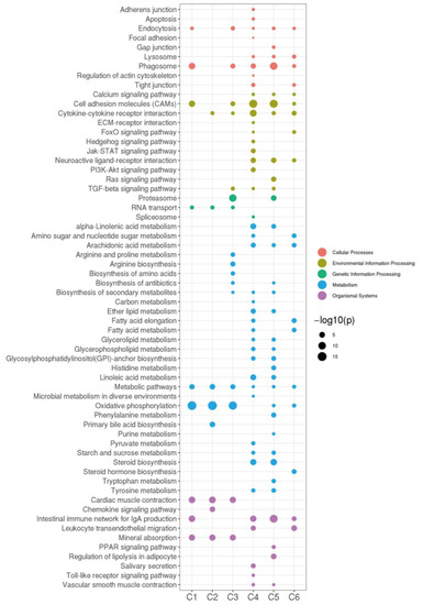 In the RNA-seq analysis, 565, 896, 1983, 473, 402, 276, 935, 973, 823, 394, and 173 DEGs were identified in profiles 9, 10, 11, 13, 15, 16, 17, 18, 19, 22, and 25, respectively, by STEM analysis (p < 0.05; Supplementary Table S4 and Figure 2d). All these DEGs were enriched in several immune pathways (Figure S1c), including IgA production of the intestinal immune network and the Toll-like receptor signaling pathway (profile 11 in particular), and disease-related pathways, such as the Jak-STAT signaling pathway, cytokine and cytokine receptor interactions, phagosomes, and cell adhesion molecules (CAMs) (profile 11). Biosynthesis pathways of amino acids, antibiotics, secondary metabolites, and carbon were enriched in profile 15. Steroid biosynthesis and retinol and drug (through cytochrome P450) metabolism were also enriched in profile 15. Metabolic pathways (antibiotics and secondary metabolites), regulation of actin cytoskeleton, neuroactive ligand–receptor interactions, phagosomes, and cell adhesion molecules (CAMs) were enriched in almost all profiles (Figure 2c). In the miRNA-seq analysis, 51, 12, 17, and 14 DEMs were identified in profiles 5, 11, 12, and 13, respectively (p < 0.05; Supplementary Table S5 and Figure 2b).