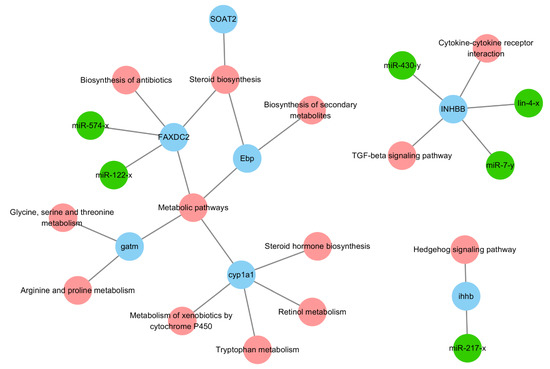 lin-4-x and miR-7-y were found to have negative correlations with faxdc2, inhbb, ihhb, soat2, and gatm, and miR-574-x was found to have a significant negative correlation with faxdc2 (Supplementary Table S8).