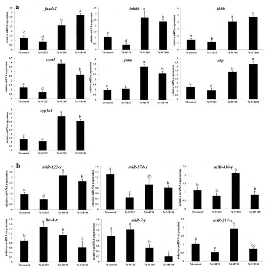 qRT-PCR verifications (n = 3): (a) testicular RNA, (b) testicular miRNA expression. The gene names and potential functions are as follows: soat2 (sterol O-acyltransferase 2-like isoform X1, steroid biosynthesis and lipid metabolism), inhbb (inhibin beta B chain-like, cytokine–cytokine receptor interaction), ihhb (indian hedgehog B protein-like isoform X1, hedgehog signaling pathway), gatm (glycine amidinotransferase, arginine and proline metabolism), faxdc2 (fatty acid hydroxylase domain-containing protein 2, biosynthesis of antibiotics), ebp (3βhydroxysteroid-Δ8,7-isomerase, biosynthesis of secondary metabolites) and cyp1a1 (cytochrome P450 1a, retinol metabolism). The miRNA names were as follows: miR-122-x, miR-574-x, miR-430-y, miR-217-x, lin-4-x, and miR-7-y. Statistically significant differences are indicated by different letters (p < 0.05).