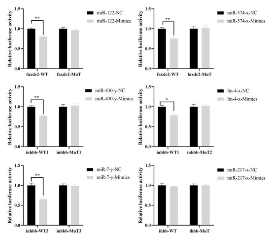 When miR122 and miR-574-x were co-transfected with faxdc2-WT, when miR-430-y, and lin-4x and miR-7-y were co-transfected with inhbb-WT, luciferase activity decreased extremely significantly compared to the control groups (Figure 6). When miR122 was co-transfected with faxdc2-MuT, miR-574-x with faxdc2-MuT, miR-430-y with inhbb-MuT, lin-4x with inhbb-MuT, and miR-7-y with inhbb-MuT, there were no statistical differences compared with the control group. These results showed that miR-122 and miR-574-x target faxdc2 and that miR-430-y, lin-4x, and miR-7-y target inhbb, which is consistent with our bioinformatics analysis of miRNA target gene predictions. However, when miR-217-x was co-transfected with ihhb-WT, luciferase activity did not decrease, indicating that ihhb is not a target gene of miR-217-x (Figure 6).