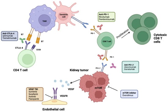 Molecular and immunotherapy targets evaluated in adjuvant RCC. ICIs of PD-1 disrupt its interaction with PD-L1, leading to enhanced T-cell proliferation and activation. Antibodies targeting PD-L1 prevent its interaction with PD1 on CD8 T cells, allowing their activation. Anti-CTLA-4 antibodies allow CD28 to bind to its receptor, B7, and activate naïve CD4 T cells. Antiangiogenetic targets include TKIs on VEGFR. mTOR inhibitors prevent tumor growth. TAM, tumor-associated macrophage; RCC, renal cell carcinoma; ICIs, immune checkpoint inhibitors; PD-1/L-1, programmed cell death 1/ligand-1; CTLA4, cytotoxic T-lymphocyte antigen 4; TKIs, tyrosine kinase inhibitors; VEGFR, vascular endothelial growth factor receptor, mTOR, mammalian target of rapamycin; TAM, tumor-associated macrophages. Created in BioRender.com.