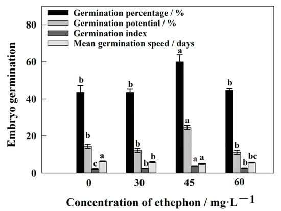 Effect of different concentrations of ethephon on embryo germination of S. pohuashanensis; data include mean values ± SE (n = 3); letters indicate significant differences at p = 0.05.