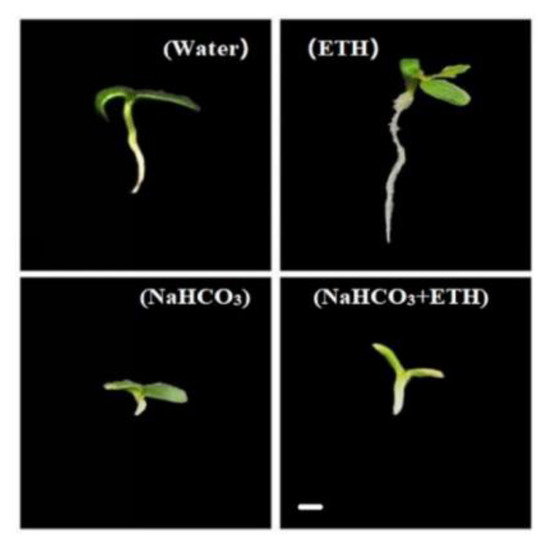 Saline-alkali stress, one of the most common abiotic stresses, affects various plant growth and development processes, from seed germination to flowering and fruiting. This stress lowers and delays germination, causes high seedling mortality, and decreases chlorophyll content and photosynthetic performance [1]. Under saline-alkaline stress, seeds absorb less water, limiting proteolytic enzyme activity, restricting respiration, and reducing germination [2,3]. In plants, ethylene is an important hormone and signal substance that participates in many physiological and biochemical processes related to growth and development. It is also involved in plant response to biotic and abiotic stresses [4].