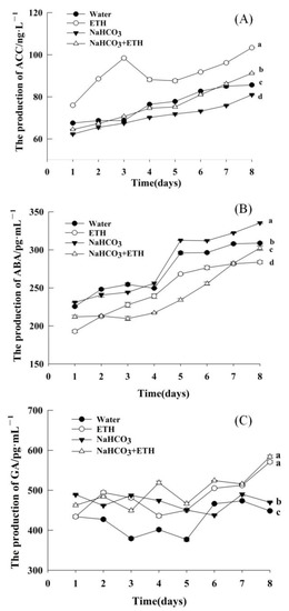 As the exogenous addition of ETH and NaHCO3 showed a difference in the germination percentage of S. pohuashanensis embryos, we further analyzed the hormone content of the seeds under various treatments during germination, daily, for eight days (Figure 3). The ACC content of embryos increased from day 1 to 8 under all treatments. Under the ETH treatment, the ACC content first increased, followed by a slight decrease, and then an increase (Figure 3A). On day 8, the content of ACC in seeds treated with ETH was significantly higher than that under the other treatments (Figure 3A). After the addition of ETH to NaHCO3, the release of ACC significantly increased. These results indicate that the exogenous addition of ETH promoted the release of ACC in embryos under NaHCO3 stress. Similarly, the ABA content also increased with time during the release of dormancy and germination of seeds under all treatments (Figure 3B). The ABA content of the seeds was in the following order: NaHCO3 > NaHCO3 + ETH > CK > ETH (Figure 3B; p). Furthermore, ETH treatment significantly increased the GA content in the embryos (Figure 3C). In the early stage of germination, the differences in GA content of seeds among the treatments were insignificant. By day 8, ETH alone resulted in high GA content, while NaHCO3 resulted in a low GA content; however, ETH added to NaHCO3 resulted in high GA content (Figure 3C).
