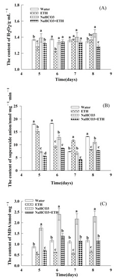 Furthermore, all treatments reduced the superoxide anion content during the middle and late stages of embryo germination (Figure 4B). The superoxide anion content of S. pohuashanensis embryos treated with NaHCO3 was significantly higher compared with those under ETH alone and in combination with NaHCO3. This observation indicates that adding ETH did not improve the superoxide anion content of S. pohuashanensis embryos subjected to NaHCO3. In addition, treatment with ETH alone resulted in lower MDA levels than the control, while NaHCO3 treatment resulted in high MDA levels (Figure 4C). However, ETH added to NaHCO3 reduced the MDA content of the embryos by 48.68%.