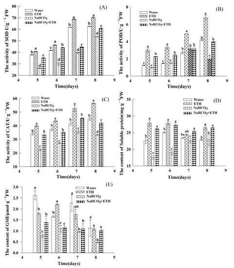 We further determined the levels of SOD, CAT, POD, soluble protein, and GSH to assess the effect of exogenous ETH and NaHCO3 on the antioxidant system during the germination of S. pohuashanensis embryos. Seedlings under NaHCO3 stress showed lower SOD, CAT, and POD activities, soluble proteins, and GSH content than the other treatments (Figure 5).