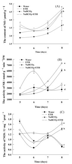 The NO content in the embryos of S. pohuashanensis showed an overall increase towards the late germination stage. NO content in the ETH-treated embryos was the highest, while that under NaHCO3 was the lowest (Figure 6A). After the addition of ETH to NaHCO3, the NO content of the embryos gradually increased by 23.84% (Figure 6A).