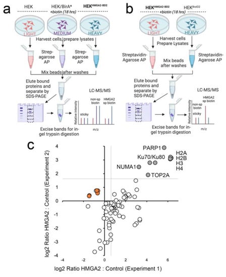 To eliminate the variability between individual control and experimental mass spectrometry (MS) runs, and to improve our ability to distinguish specific but low abundance interactors from the larger number of non-specifically biotinylated and abundant sticky proteins, we used stable isotope labeling by amino acids in culture (SILAC)-based metabolic labeling. This approach allowed us to combine the proteins captured from separate control and HMGA2 experiments prior to elution from the affinity matrix and subsequent MS analysis (Figure 2a,b). The amount of protein captured in the experimental vs control condition was thus determined in a single MS run. Briefly, cells were differentially labeled with media containing either, environmental forms of the essential amino acids Arginine and Lysine (Arg0Lys0, Light media), or isotopic forms (Arg6Lys4, Medium; Arg10Lys8, Heavy) (Cambridge isotope Laboratories, Tewksbury, MA, USA; Athena ES, Baltimore, MD, USA). Biotin (Sigma-Aldrich, St. Louis, MO, USA) was added in excess to the media (50 μM) and the cells were harvested 18 h later by scraping them into an ice-cold high-salt RIPA buffer (50 mM Tris pH 7.5, 500 mM NaCl, 1% NP-40, 0.5% deoxycholate, protease inhibitors), sonicating, and clearing by centrifuging at 21,000× g for 10 min at 4 °C. Total protein concentrations were measured using the Pierce BCA Protein Assay Kit (Thermo-Fisher, Waltham, MA, USA). The salt concentration in the whole cell extracts was then reduced to 250 mM by adding an equal volume of “no salt” (0 mM NaCl) RIPA buffer, and equivalent amounts of total protein extract for each condition were incubated with Streptavidin-agarose beads (Thermo-Fisher, Waltham, MA, USA) at 4 °C for 4 h. Following an initial wash with RIPA buffer, beads from the control and experimental pulldowns were combined for additional washes and bound proteins eluted with 2% SDS/30 mM biotin. The eluted proteins were reduced and alkylated by treatment with DTT and iodoacetamide, respectively. Sample buffer was then added and the proteins resolved by electrophoresis on a NuPAGE 10% BisTris gel (Thermo-Fisher, Waltham, MA, USA). The gel was stained using SimplyBlue Safestain (Thermo-Fisher, Waltham, MA, USA) and the entire lane was cut into five slices. Each slice was cut into 2 × 2 mm fragments, destained, and digested overnight at 30 °C with Trypsin Gold (Thermo-Fisher, Waltham, MA, USA).