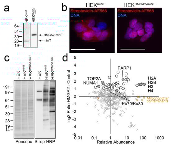 The Flag-tagged HMGA2-BioID2 fusion protein, and Myc-tagged BioID2 biotin ligase control, run at the expected sizes on a Western blot when detected in HEK293 lysates using anti-Flag and anti-myc antibodies, respectively (Figure 1a). Providing excess biotin to the cells for 4 h induced distinct protein biotinylation patterns that could be detected by probing cell lysates with streptavidin-HRP on a Western blot (Figure 1b), or by staining fixed cells with fluorophore-tagged streptavidin (Figure 1c). Consistent with HMGA2 being predominantly associated with chromatin, the biotinylation pattern of BioID2-tagged HMGA2 was almost exclusively nuclear. In contrast, the diffuse BioID2 ligase alone non-specifically biotinylated proteins throughout the cell (Figure 1c). The biotinylated protein bands observed in the parental HEK cell lysates (Figure 1b) primarily represent mitochondrial carboxylases (e.g., PC, MCCC1/2) that can bind biotin directly, and were also detected as a weak mitochondrial staining pattern in fixed HEK cells (Figure 1c) [42]. These proteins are known background contaminants found in all BioID experiments and are useful for normalization.