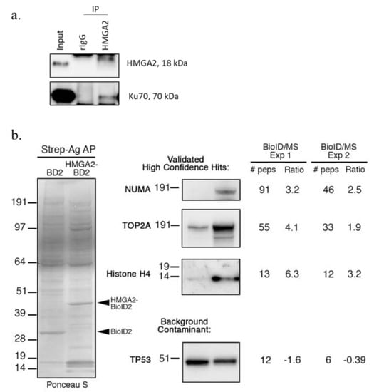 Our proximity labeling experiments confirmed several previously described HMGA2 interaction partners. For example, our previous IP studies had identified the early DNA damage sensor PARP1 as an interaction partner of HMGA2 in human breast cancer cells [41]. PARP1 was among the top candidates in our BPL list of HMGA2 interaction partners (Table 1; Figure 2c; Figure 3d), which provided further validation for the new role of HMGA2 in enhancing PARP1-mediated protein ADP-ribosylation of proteins. The non-homologous end-joining (NHEJ) DNA repair factors XRCC6/Ku70 and XRCC5/Ku80 had also previously been demonstrated to interact with HMGA2 [29,48]. We focused on XRCC6/Ku70 and demonstrated co-precipitation of Ku70 with HMGA2 from MDA231 human breast cancer cell nuclear extracts (Figure 4a). Three additional proteins, predicted by our BPL analyses to be interaction partners of HMGA2, were validated by streptavidin pulldown and Western blot detection using specific antibodies to NUMA, TOP2A, and histone H4 (Figure 3b and Figure 4b). We demonstrated a significant increase in the amount of biotinylated NUMA, TOPO2A, and H4 proteins captured in pulldowns from HEK293-HMGA2-BioID2 protein lysates compared to HEK293-BioID2 protein lysates (Figure 4b), which confirmed the quantitative MS data (Figure 2c). To demonstrate the specificity of the identified HMGA2 interactors, we show a representative background contaminant protein (TP53) that is biotinylated non-specifically by both HMGA2-BioID2 and BioID2 alone (Figure 4b). Our repeated attempts to purify a stable HMGA2-TOP2A complex by IP were unsuccessful, which suggests that their interaction is transient. An advantage of BPL over classical antibody-based co-IP studies is the fact that, in addition to detecting stable protein interactions, BPL can also identify biologically relevant transient (or lower affinity) protein-protein interactions. Future studies will explore the functional relevance of the novel HMGA2 interactions that we have mapped.