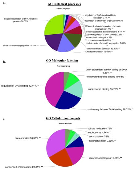 (a–c) Gene ontology analysis of the 62 top candidate proteins identified in the HMGA2-BioID2 and -miniTurbo biotin proximity assays. Nuclear chromatin- and nucleosome associated processes and functions constitute the main GO terms associated with the top 62 HMGA2 nuclear interaction candidates identified by biotin proximity labeling in unchallenged HEK293 cells. Percentage distribution of major (a) GO–Biological processes, (b) GO–Molecular functions, and (c) GO–Cellular components, as determined by Cytoscape version 3.8 and ClueGo v2.5.9. Adjusted p-values considered statistically significant as denoted by ** p < 0.001.