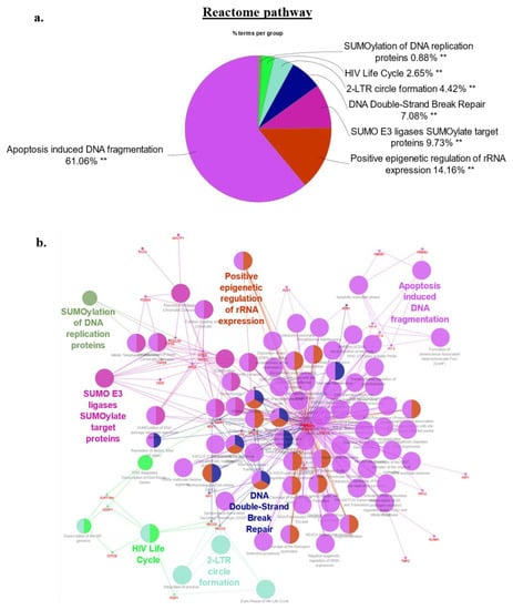 (a,b)REACTOME pathway analysis of the 62 top candidate proteins identified in the HMGA2-BioID2 and -miniTurbo biotin proximity assay. (a) There were 7 REACTOME pathway groups identified, with the two largest groups 5 and 6 mainly encompassing nucleosomal and chromatin-associated processes, and contributing approx. 75% of all pathways due to the over-representation of nucleosomal histone interaction partners of HMGA2 in both pathways. Pathways with more diversified contributions by HMGA2 interaction partners included post-translational protein SUMOylation related REACTOME pathways, accounting for 10%, and double stranded DNA repair (7%). A detailed list of contributing HMGA2 interaction partners to the Reactome pathways is presented in Suppl. Figure S1a–d. (b) Network map with identical color coding of key Reactome pathways. Analysis was performed with Cytoscape version 3.8 and ClueGo v2.5.9. Adjusted p-values considered statistically significant as denoted by ** p < 0.001.