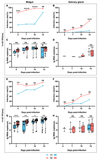 Vector competence of Ae. albopictus JH and GZ strains to ZIKV. The upper panel shows the results of the infection rate and viral RNA copies in two Ae. albopictus strains infected with a low dose of ZIKV (1 × 106 PFU/mL), and the lower panel shows the results of a high dose of ZIKV infection (1 × 107 PFU/mL). Infection rate in the midgut (A,E) and salivary gland (B,F) of two mosquito strains. Viral RNA copies (log 10 transformation) in the midgut (C,G) and salivary gland (D,H) of two mosquito strains. The infection rate of the two Ae. albopictus strains were compared using Fisher’s exact test, and viral RNA copies were compared using the non-parametric Mann–Whitney test (Mann–Whitney test requires at least two values in each group; the data that did not meet this standard were not compared) to determine the differences between the two strains at different times, since the viral RNA copies did not conform to a normal distribution (Shapiro–Wilk test). Box plots show the median and the 25th to 75th percentiles, and the whiskers denote the minimum and maximum values. * p < 0.05, ** p < 0.01, *** p < 0.001 and **** p < 0.0001, ns: no significant difference.