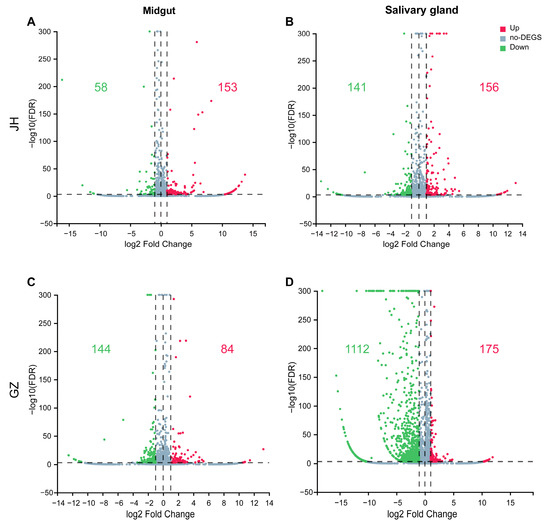 Volcano plot of DEGs (|log2FC| > 1, FDR < 0.001). mRNA expression levels in the midgut (A,C) and salivary gland (B,D) of Ae. albopictus JH and GZ strains infected with ZIKV were compared to those of the non-infected. Red and green plots in-dicate significantly upregulated and downregulated genes, respectively. Light blue plots indicate genes that were not significantly different between the infected and non-infected groups. Number of up- or downregulated genes was shown in the relative quadrant with the same color.