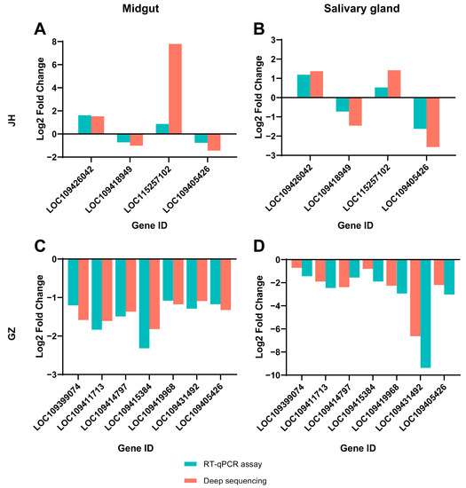 RT-qPCR and transcriptome analysis of 10 DEGs. Four DEGs in the JH strain (A,B) and seven DEGs in the GZ strain (C,D) (including one gene that was differentially expressed in both strains) were selected for RT-qPCR validation. The fold changes determined from the RT-qPCR assay and deep sequencing are shown.