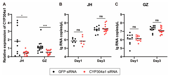 CYP304a1 silencing and ZIKV infection in Ae. albopictus. (A) Abundance of CYP304a1 after RNA interference. Mosquitoes were microinjected with GFP and CYP304a1 siRNA, and the relative expression of CYP304a1 in the mosquitoes was detected by RT-qPCR. One dot represents 1 mosquito, and the horizontal line represents the median of the results. Differences between two groups were compared by the non-parametric Mann–Whitney test. The siRNA knockdown efficiency of CYP3304 a1 in the JH and GZ strains was 65.5% and 53.5%, respectively. ZIKV RNA copies were in the Ae. albopictus JH (B) and GZ (C) strains. The ZIKV suspension was inoculated by thoracic microinjection at 3 days post-CYP304a1 silencing. The viral load was assessed at 1 and 3 dpi through RT-qPCR. One dot represents 1 mosquito, and the horizontal line represents the mean of the results. The data were analyzed by 2-way ANOVA with Šídák’s multiple comparisons test. * p < 0.05 and *** p < 0.001. ns, no significant difference.