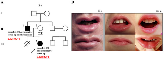 The proband of family 6 is female (F-6; III-2), an only child with complete CP. Her father was also born with complete CP (F-6; II-1). Initially, the possibility of VWS was ruled out since they lack lower lip pits. However, a subsequent examination showed an asymmetric lower lip in both the affected father and daughter (Figure 2B), which may subtly indicate the presence of VWS. In addition, the father presents with hypodontia. Other family members were reportedly unaffected. Only the proband’s parents were available for the co-segregation analysis, and the variant was confirmed in the sample of the affected father, but not the unaffected mother (F-6; II-2) (Figure 2A).