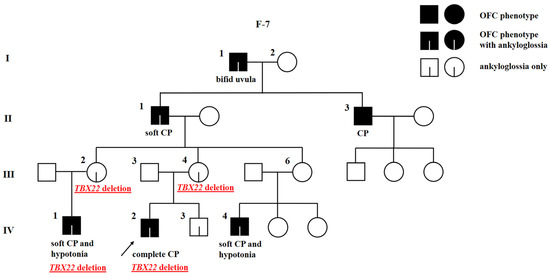 Pedigree of family 7 (F-7) with X-linked cleft palate with or without ankyloglossia and deletion of TBX22. The proband is marked with an arrowhead. Genotype is given underneath each genetically tested individual. Roman numerals stand for the generations, while Arabic numerals stand for the individual members of the family. OFC, orofacial cleft; CP, cleft palate.