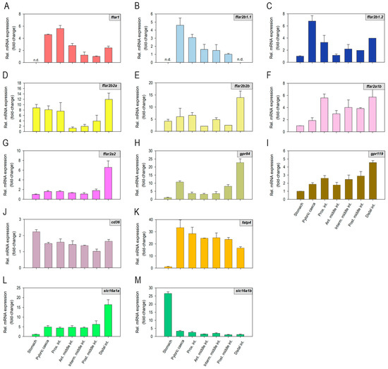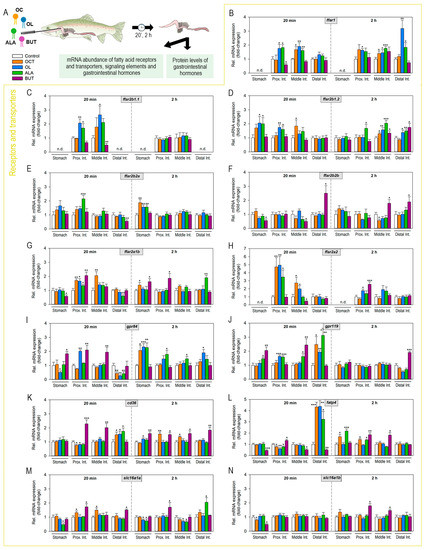 2.1. Fatty Acid Receptors and Transporters mRNAs Are Differentially Expressed along the Rainbow Trout Gastrointestinal Tract
