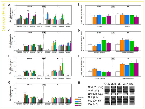 2.3. Gastrointestinal mRNA Expression of Intracellular Signaling Molecules Is Altered by the Luminal Presence of Fatty Acids