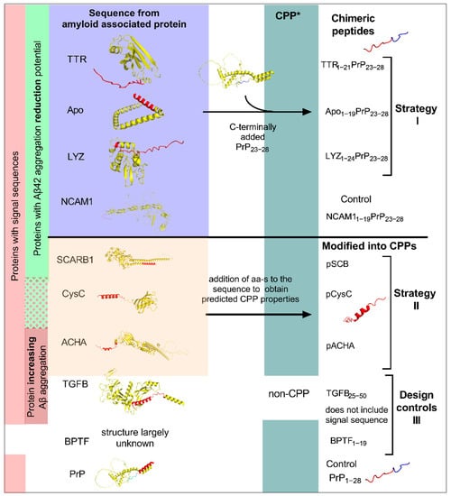 Structures of proteins used for the design of the peptides, design principle of anti-aggregation peptides, and controls. Protein identificators: mouse Transthyretin, TTR–P07309, 2QPF; mouse Apolipoprotein A-II, Apo-P09813; human Lysozyme C, LYZ–P61626; mouse Neural cell adhesion molecule 1, NCAM1– P13595; mouse major prion protein, PrP P04925; mouse Scavenger receptor class B member 1, SCARB1–Q61009; mouse Cystatin-C, CysC–P21460; mouse Neuronal acetylcholine receptor subunit alpha-7, ACHA–P49582; human Transforming growth factor beta-2 proprotein, TGFB–P61812; human Nucleosome-remodelling factor subunit BPTF, BPTF–2F6J. Firstly, proteins with signal sequences and known association with amyloids were chosen. In the case of CysC, the reduction has been associated mainly with human CysC, whereas in this work the mouse CysC is used. Depending on their suggested effected on Aβ42 the proteins were divided into aggregation-reducing and aggregation-increasing proteins. Secondly, predictions were made on the sequences, and specific regions and modifications were chosen to be included in the sequences. Proteins structures (yellow) have marked peptide sequences included in the peptide design (red, for specific sequence part refer to Table S2). Design was divided into two: creation of chimeric peptide by addition of the PrP23–28 (marked in blue) (I), or modification of the sequence into a cell-penetrating peptide (II). Additional controls besides NCAM11–19PrP23–28 and PrP1–28, TGFB, and BPTF derived peptides, were used (III). These designed peptides did not contain signal sequences. *—CPP prediction was done with CPP predictor and CellPPD. The regions of the section included in the design is shown in the right column (red), chimeric peptide marked as fusion of two parts (red and blue), where the blue is the PrP23–28.