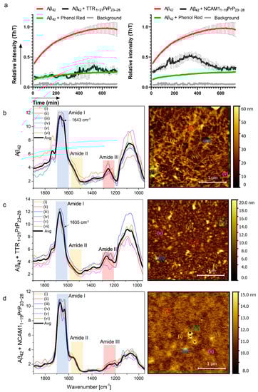 The interaction of the Aβ42 peptide with the aggregation inhibitor peptides was further investigated using atomic force microscopy combined with infrared spectroscopy (AFM-IR). This technique has the advantage of simultaneously providing morphology visualization of the amyloid aggregates and spectroscopic information at the nanoscale, being successfully used in the characterization of the fibrillization pathway of amyloidogenic nanoparticles. Topography data from specimens containing only the Aβ42 peptide revealed that these samples are populated by an intricate network of fibers, consistent with the formation of amyloid plaques (Figure 2b). High resolution images from Aβ42 aggregates unveil that the fibers are composed of intertwined fibrils (Figure S5d). Fibers in these networks have diameters around 100–150 nm, with the lengths near to the micrometer range (Figure S5d). Infrared spectra from Aβ42 fibers exhibit sharp resonances across the amide I and amide III bands and can be used to devise information on the secondary structure of aggregates. The amide I band is featured by a strong resonance centered at ~1670 cm−1 along with a shoulder at 1643 cm−1, indicating the presence of β-turns and anti-parallel β-sheets [41]. A vibration centered at 1259 cm−1 in the amide III range is harder to interpret and is often assigned to a complex combination of COO-, C-N, C-C stretching, C-H, and N-H bending [41,42]. In the presence of the TTR1–21PrP23–28 peptide, the morphology of the aggregates dramatically changes (Figure 2c), and fibrils are no longer observed in the samples. Topography images obtained at high resolution show the complete inhibition of fibers even at the nanoscopic scale. Instead, the aggregates in the mixtures have irregular shapes and are characterized by globular geometry with sizes reaching a few hundred nanometers (Figure S5b). Like Aβ42 fibers, the infrared spectra display distinctive resonances across the amide range. However, a noteworthy deviation is observed in the characteristic peak at 1643 cm−1, which has shifted to 1635 cm−1. This shift indicates a reorganization of the peptide arrangement, suggesting that the presence of the TTR inhibitor has likely caused a decrease in the β-sheet content. In mixtures containing the control NCAM11–21PrP23–28 peptide, the formation of fibers is also suppressed, as indicated by the AFM topography data shown in Figure 2d. In this case, the specimens are characterized by an anamorphous matrix encrusted with aggregates with diameters of about 300 nm. A downshift of the β-sheet peak to 1633 cm−1 corroborates the decrease in the fraction of these secondary conformations in the self-assemblies.