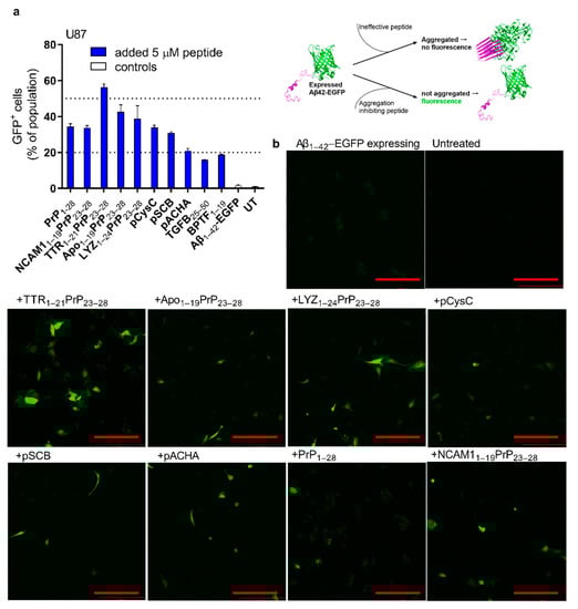 Addition of the peptides leads to the reduction in aggregation. Peptide efficacy was assessed in U87 cells transfected with Aβ1–42-GFP fusion protein expressing plasmid. (a) The reduction in the aggregation of the expressed Aβ1–42-GFP assessed with flow cytometry. Cells were transfected with 0.5 µg Aβ42–EGFP fusion protein expressing plasmid. After 2 h incubation, the cells were washed and the peptides were added at the final concentration of 5 µM to the cells. 24 h post-addition of the peptides, the cells were detached and cell population with fluorescent signal was detected. To set the threshold for GFP+ cell population, untreated cells were used. (b) Confocal microscopy live cell images of controls and cells treated with peptides. After transfection media was replaced with fresh media and peptides were added at the final concentration of 10 µM. 24 h post-addition of the peptides images were taken to detect fluorescent signal from the expressed and non-aggregated Aβ42–EGFP. Red bar 200 µm. Images were taken with 63× oil immersion objective.