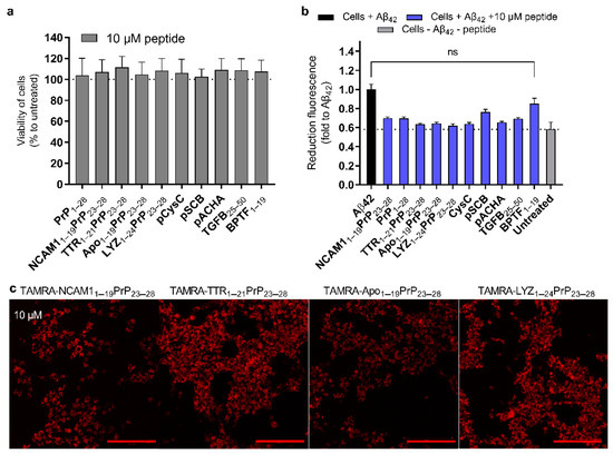 Firstly, to confirm the safety of the peptides themselves, we show that the peptides did not affect the viability of the cells in serum containing media (Figure 4a). Similar results were seen in the serum containing media with other peptide concentrations (Figure S12a). Interestingly, in serum free conditions the PrP1–28 led to a decrease in the cell viability already at the low concentrations (Figure S12b), whereas the TTR-derived, the Apo-derived, the pCysC, and the NCAM1-derived peptides reduced cell viability only at 20 µM concentrations in the serum free media. Another toxicity assay was included in the screening, as it has been indicated in several works that the use of MTS- or MTT-based assays in combination with the Aβ may lead to misinterpretation of the results. The aim was to find any indications of the changes in the viability of the cells after the addition of the peptides. The viability of cells was not reduced due to the addition of inhibition peptides (Figure S13a). In the case of the PrP1–28, the reduction in the viability of cells in serum free media was observed at already at 2.5 µM peptide concentration, and over 20% reduction in the case of the 20 µM peptide (Figure S12b).