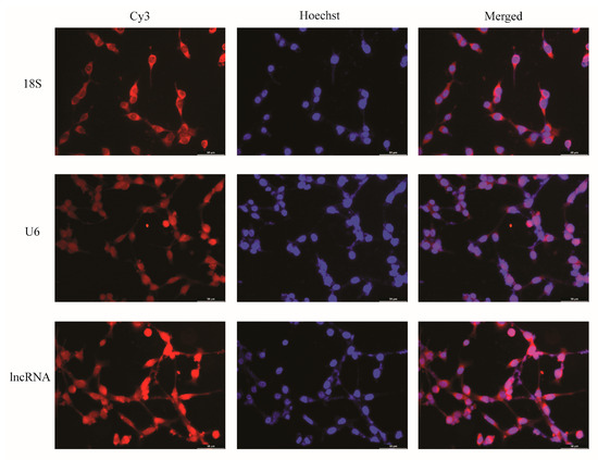 RiboTM lncRNA FISH Probe Mix (lnc11001001, RIBOBIO) and RiboTM Fluorescent in Situ Hybridization Kit (C10910, RIBOBIO) were used for the FISH of lncRNA, thus detecting the distribution of the target lncRNA. The cell slides were placed at the bottom of a 24-well plate and each well was plated with 1 × 105 cells. After the cells had grown to about 80%, the cells were washed with phosphate-buffered saline (PBS) and fixed with 4% paraformaldehyde. Subsequently, the cells were washed again and treated with permeabilization solution, then 200 μL of prehybridization solution was added and the cells were blocked at 37 °C for 30 min. The prehybridization solution was discarded and 100 μL of the hybridization solution containing the lncRNA FISH probe was added for overnight hybridization at 37 °C. Next day, the cells were washed by PBS and stained with DAPI and photographed by fluorescence microscopy, with 18S and U6 as the reference genes.