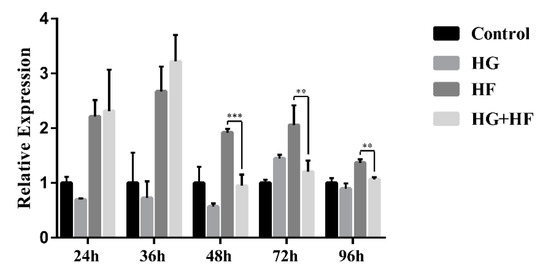 Based on different glycolipid environments, our experiment was divided into four experimental groups: control (5 mmol/L D-glucose + PBS), high glucose (HG) (30 mmol/L D-glucose + PBS), high fat (HF) (5 mmol/L D-glucose + 400µmol/L sodium palmitate), and high glucose and high fat (HG + HF) (30 mmol/L D-glucose + 400µmol/L sodium palmitate) [56,57]. The expression of the target lncRNA in each group was determined by qRT-PCR after 24 h, 36 h, 48 h, 72 h, and 96 h.