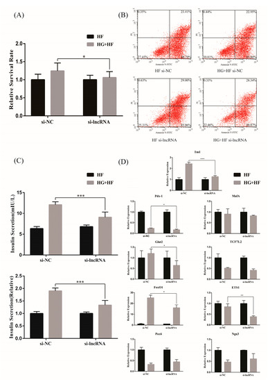 To further explore the effect of lncRNA ENST00000462455.1 on the activity and function of MIN6, the siRNA against ENST00000462455.1 was transfected into MIN6 to silence the expression of the lncRNA. The results of RT-qPCR confirmed that the silencing effect was stable (Figure S3). Subsequently, we explored the effect of ENST00000462455.1 on MIN6 activity by the CCK-8 assay. Taking the HF group as a reference, we found that the relative survival rate of MIN6 in the HG + HF group with si-lncRNA was lower than that in the si-NC group (si-NC vs. si-lncRNA: 1.24 ± 0.21 vs. 1.06 ± 0.16, p < 0.05) (Figure 4A). Similarly, by flow cytometry, we observed that the relative apoptosis rate of MIN6 in the HG + HF group with si-lncRNA was higher than that in the si-NC group (Figure 4B). Meanwhile, the insulin level in the supernatant of the MIN6 cultured under the corresponding glycolipid environment for 48 h was detected by ELISA, thus assessing the effect of ENST00000462455.1 on the insulin secretion of MIN6. The results showed that the insulin secretion of MIN6 in the HG + HF group with si-lncRNA was lower than that in the si-NC group (si-NC vs. si-lncRNA: 12.06 ± 0.70 mIU/L vs. 9.07 ± 1.20 mIU/L, p < 0.001; si-NC vs. si-lncRNA(relative): 1.90 ± 0.11 vs. 1.33 ± 0.18, p < 0.001) (Figure 4C). In addition, RT-qPCR was also used to detect the expression levels of relevant key transcription factors. Taking the HF group as a reference, we found the expression levels of Ins1, Pdx-1, Glut2, FoxO1, and ETS1 in the HG + HF group with si-lncRNA were lower than those in the si-NC group (p < 0.05) (Figure 4D). Therefore, under a high-glucose and high-fat environment, the decreased expression of lncRNA ENST00000462455.1 could lead to the lowering of MIN6 cell activity and the occurrence of dysfunction.