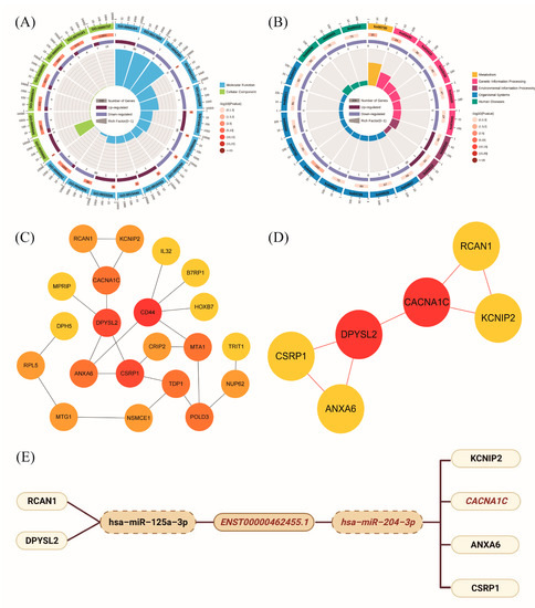 We further explored the possible mechanism of ENST00000462455.1 by constructing a ceRNA network which included lncRNA ENST00000462455.1 and its corresponding 14 miRNAs and 118 mRNAs (Figure 5). Given that miRNAs play an important role in the ceRNA network, we identified key miRNAs by searching the literature. Based on the available evidence, we found that miR-204-3p and miR-125a-3p were associated with type 2 diabetes or pancreatic β cells dysfunction, and 29 mRNAs corresponding to these two miRNAs were found in the ceRNA network (Table S4). Subsequently, GO and KEGG analysis were performed on these mRNAs (Figure 6A,B). The results indicated that CACNA1C, CSRP1, ANXA6, KCNIP2, and DPYSL2 are enriched in multiple pathways of BP, CC, and MF (Tables S5–S7). In particular, the results of the KEGG analysis showed that CACNA1C was enriched in multiple pathways including type 2 diabetes and insulin secretion (Table S8). Meanwhile, compared with the control group, the GSEA results found that CACNA1C was a core gene and the expression of it was decreased in hypertriglyceridemia subjects with T2DM (Table S9, Figure S4). In addition, we explored the interaction of key mRNAs in the ceRNA by establishing a PPI network, and a key network module was identified by cluster analysis: CSRP1-ANXA6-DPYSL2-CACNA1C-RCAN1-KCNIP2 (MCODE score: 2.8) (Figure 6C,D). Based on the above results, the possible ceRNA regulatory axis of lncRNA ENST00000462455.1 is shown in Figure 6E. Among them, ENST00000462455.1/miR-204-3p/CACNA1C may be the core regulatory axis.