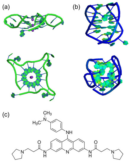Cartoon representation of the PDB structures of AG(TTAG) (Tel22) with different cations: (a) Tel22 crystal structure in K, PDB 1KF1 [25], (b) Tel22 structure in Na, PDB 143D, as obtained from nuclear magnetic resonance experiments [24]. (c) Molecular structure of BRACO19.