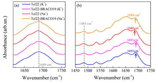 The presence of the peak at 1484 cm in the Attenuated Total Reflectance-Fourier Transform Infrared (ATR-FTIR) spectra shows that the G4 structures are preserved also at the investigated hydration level, as evidenced in Figure 2b. On the other hand, important conformational changes in the G4 topology occur in the hydrated samples. In particular, in Tel22 (K) and Tel22-BRACO19 (K) spectra, the guanine C6=O6 carbonyl stretching vibrational peak is located at 1691 cm, showing that the predominant conformation of G4s stabilized by K is the parallel one [40]. The same peak, however, is shifted towards lower wavenumbers in the presence of Na, nominally at 1686 cm in the case of Tel22 (Na) and at 1688 cm for Tel22-BRACO19 (Na), suggesting that the Na stabilized G4s tend towards a mixture of antiparallel/parallel conformations [40]. As it turns out, complexation with BRACO19 does not seem to induce any major conformational variations (at least at the selected hydration level).