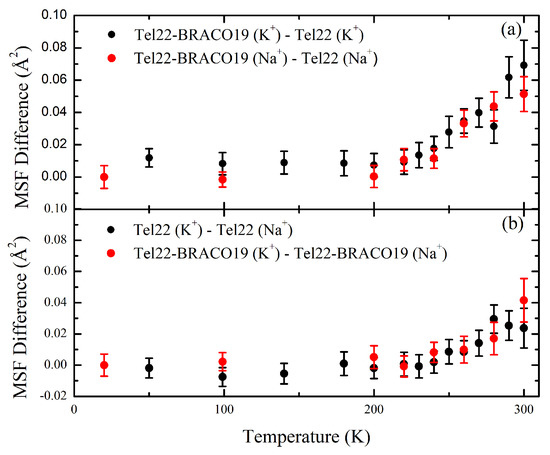 The MSF calculated through a Gaussian fit of the elastic intensity of Tel22 (K), Tel22 (Na), Tel22-BRACO19 (K), and Tel22-BRACO19 (Na) in the [1.0–4.6] Å Q range are reported in Figure 3 as a function of temperature along with the best fits using Equation (4) to obtain the characteristic force constants (see Table 1). It is worth of note that, since the incoherent intensity in our samples is dominated by Tel22, with BRACO19 only contributing for 20% of the signal, the estimated MSF mainly represent the biomolecular internal dynamics. A marked change in the slope of the MSF was observed in the [225–235] K temperature range, likely related to a dynamical transition. This phenomenon, which has already been observed in other biological systems like proteins, is associated to the onset of anharmonic motions in the biomolecule, such confined reorientations of molecular groups [41,42]. These fluctuations are known to be coupled to the motions of the hydration shell water molecules [36]. As for the uncomplexed samples, at low temperatures the MSF are almost the same, while at higher temperatures Tel22 (Na) displays smaller MSF than those obtained in the presence of K, thus indicating that Na promotes a more stable quadruplex structure.