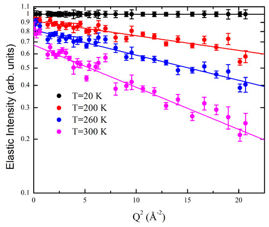 Normalized elastic scattered intensity (logarithmic scale) as a function of for Tel22 in the presence of K ions at four different temperatures. In this scale the Gaussian fit using Equation (2) over the [1.0–4.6] Å Q range appears as a linear plot.